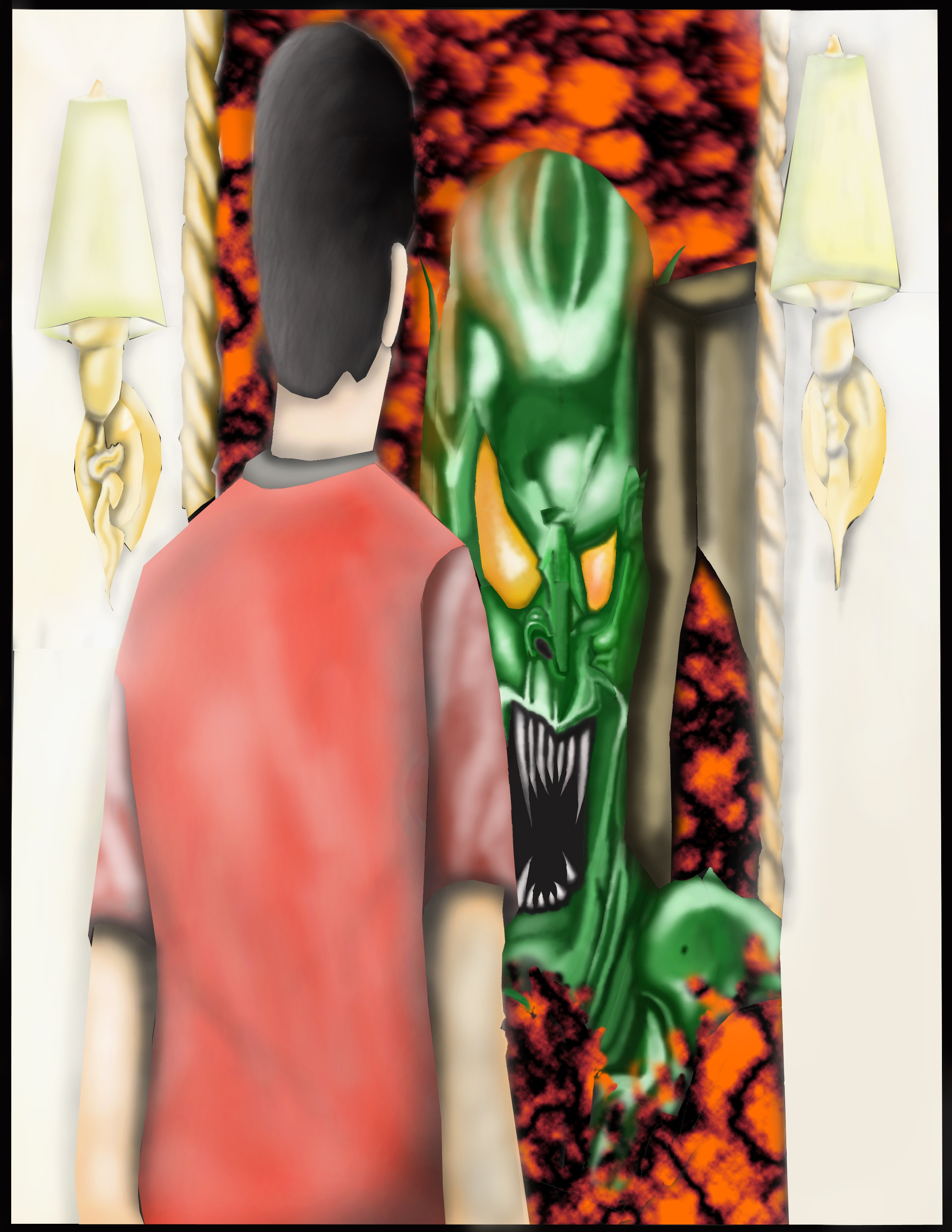 Done for a Contest “Harry Meets Green Goblin” By Steven Renner This painting was first done as a rough draft utilizing only pencil and paper after which it was scanned into Adobe Photo Shop CS3 and painted using multiple layers to achieve the wanted depth and effect.